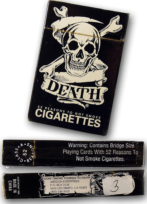 "Bridge size playing cards with 52 reasons to not smoke cigarettes." Death skull and cross bones logo in black and white.