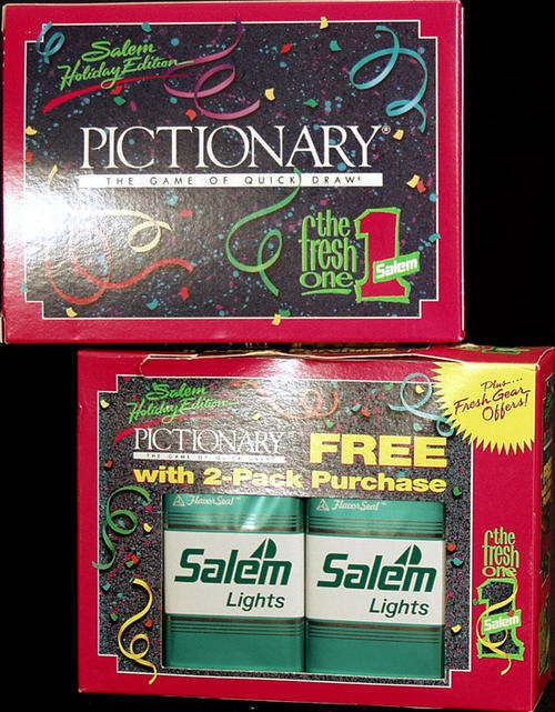Pink box; "Salem Holiday Edition Pictionary Free with 2 Pack Purchase" "The Fresh One, Salem" Plus Fresh Gear Offers".
