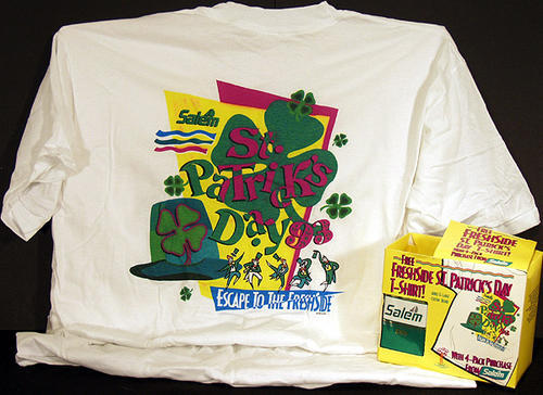 "Free Freshside St. Patrick's Day T-Shirt! with 4 pack purchase from Salem" Cotton blend T-Shirt. Yellow box with purple print. Salem 100s and Salem gold.