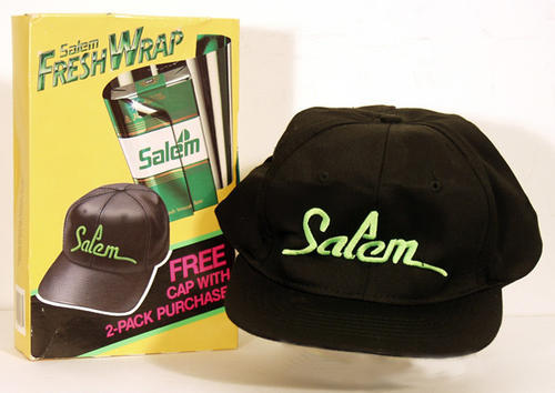 "Free cap with 2 pack purchase." in pink on yellow and black box. Black cap with green neon style "Salem Lights"