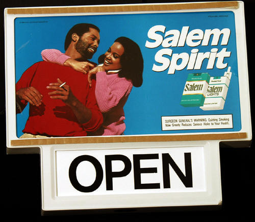 Salem Ethnic open/closed window sign. Blue background with text "Salem Spirt" with two packs and African American couple pictured.
