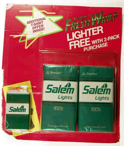 Salem Fresh wrap lighter free with 2 pack purchase. "Additional T-shirt offer inside!" Green and white print on pink. Lighter is mini pack. Lights 100s.