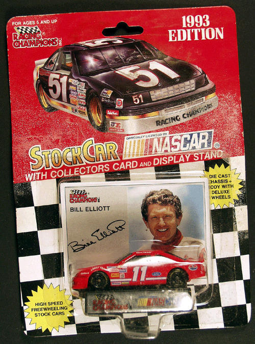 Minature toy car with card - photo of Bill Elliot and signature. 1993 Edition racing championship, Inc. NASCAR.