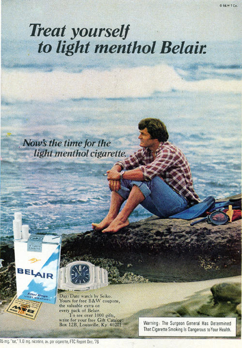 Treat yourself to light menthol Belair. Now's the time for the light menthol cigarette. Day/Date watch by Seiko. Yours for free B&W coupons, the valuable extra on every pack of Belair. To see over 1000 gifts, write for your free Gift Catalog. Box 12B, Louisville, KY 40203. 15 mg. "tar," 1.0 mg nicotine, av. per cigarette, FTC Report December 1976 Warning: The Surgeon General Has Determined Cigarette Smoking is Dangerous to Your Health. product offer, catalog offer Playboy: April 1977