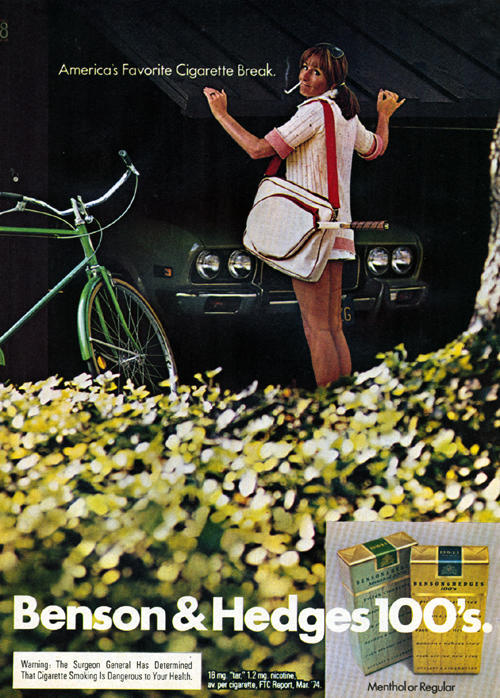 Benson & Hedges 100's. Shows woman preparing to go play tennis. Text: "Americas Favorite Cigarette Break."