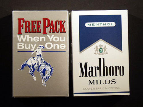 Cowboy Christmas, Marlboro promotion. Christmas in July: buy one pack and get one free. Picture of Marlboro Milds (white and blue packaging) silver outer package with cowboy riding a bucking horse.