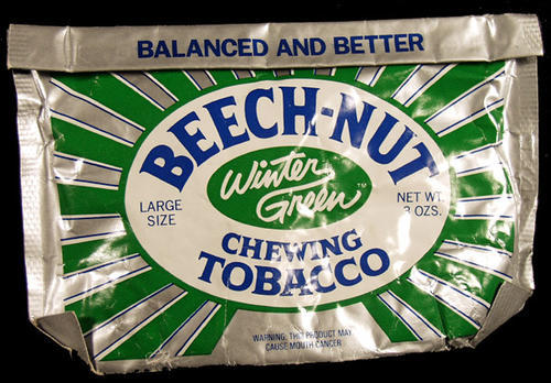 Silver and green pouch of Beech-Nut wintergreen chewing tobacco.