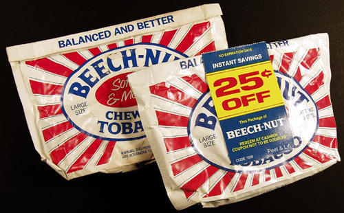 Red, white and blue pouch of Beech-Nut chewing tobacco.