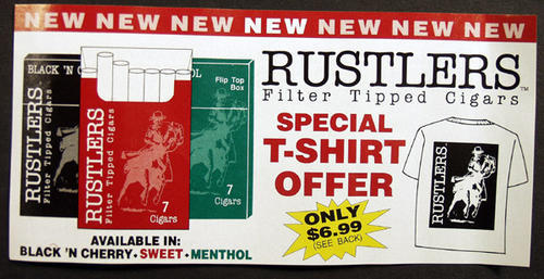 Special T-shirt offer from Rustlers filter tipped cigars. Rustlers is available in Black 'N Cherry and Sweet and Menthol.