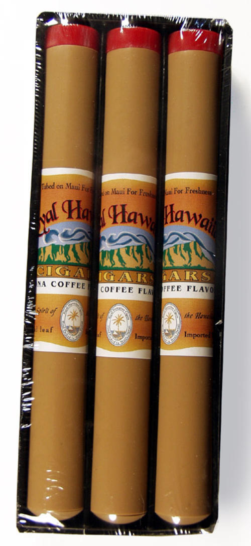 3 "Kona Coffee" flavored cigars in plastic cases and then wrapped in plastic.