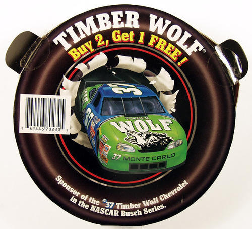 Buy 2 get 1 free cans of Timberwolf smokeless tobacco in cas shaped box with Nascar car on front.
