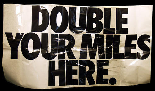 "Double Your Miles Here" Large white poster with bold black letter. Marlboro miles.