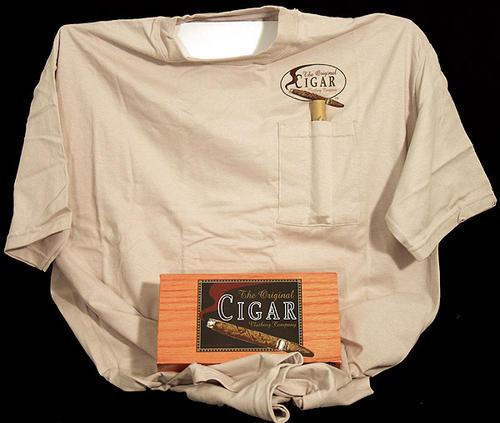 Custom cigar pocket (to hold a cigar) T-shirt XL, Beige shirt w/logo above sewn pocket in a mock cigar box.