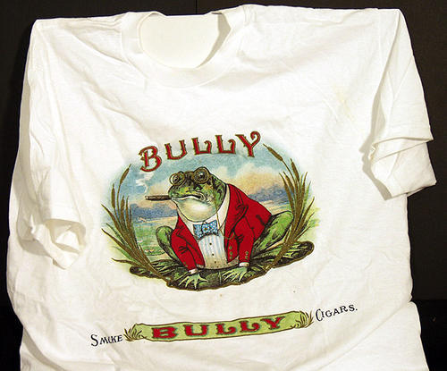 White t-shirt w/Bully Cigars Logo; Five cent cigar co. logo on back; w/" Sportswear Hats Smokin' ".