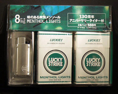 Lucky Strike cigarettes with free lighter, Japanese promotion.