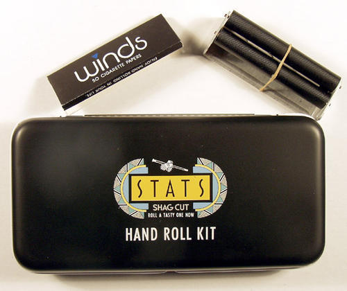 50 cigarette papers and rolling machine in ablack tin. STAT's shag art Hand Roll Kit.