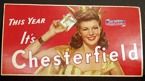 Poster of then Miss America Rosemary LaPlance dressed like Lady Liberty holding a cigarette pack. "This year it's Chesterfield."