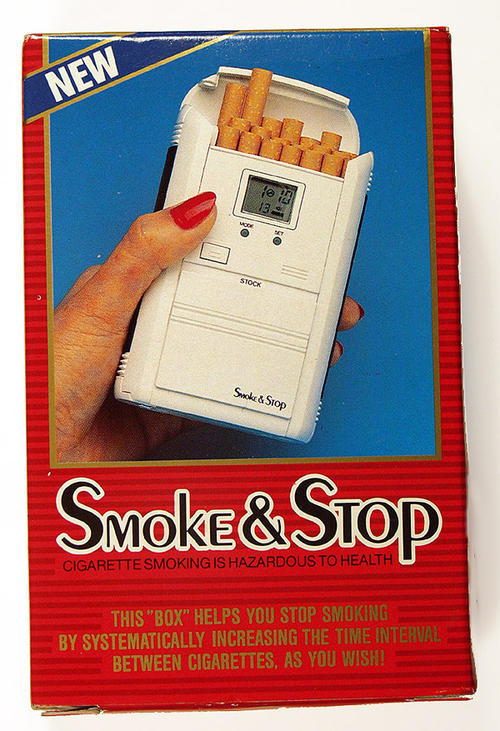 Smoke e Stop- Battery operated cigarette pack holder. Timer to indicate time between removing cigarettes from pack. Use is unclear.