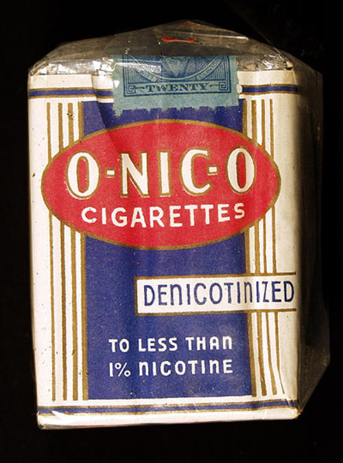 O-Nic-O: One of the major brands between 1920-195- that enjoyed minor success due to its claim of reduced nicotine. Less than 1% nicotine. All the pleasure but milder & safer- recommened by prominent physicians. We guarantee the nicotine content & also that our process of removing nicotine is a non-chemical one.