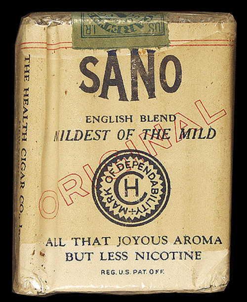 Mild English Blind Cigarettes- Sano! One of the major brands between 1920-1950 that enjoyed minor success due to its claim of reduced nicotine. Al that joyous aroma but less nicotine. Cigarettes contained in this package are prepared by Rhe Health Cigar Co., Inc from choicest aged tobaccos grown in Turkey & the United States, scientifically processed & blended to eliminate the bulk of nicotine. Although extremely mild they retain their delightful favor & aroma.