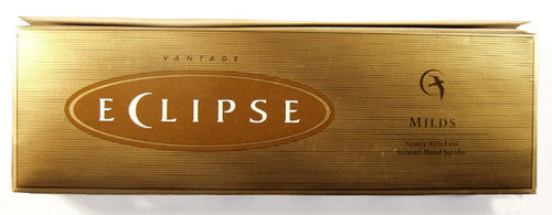 Eclipse regular mild cigarettes. GOld carton with dark brown and white lettering. Nearly 90% less second hand smoke.