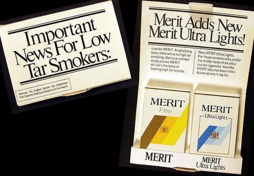 Introducing a new low tar procduct. Merit Ultra Lights and Merit packaged together. Actual cigarettes are not in packaging.