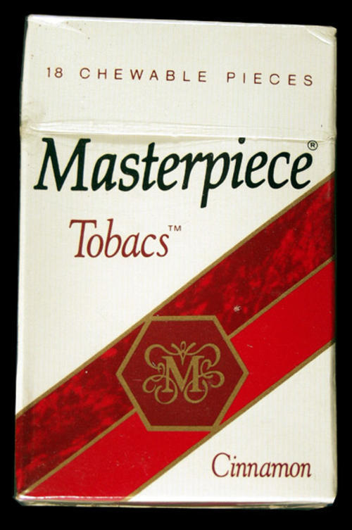 Masterpiece (Pinkerton, 1987). A 1mg nicotine chewing gum. Nicotine comes from shreds of tobacco in the gum. Regulated as a food by the FDA since chewing gum is a food, and declared to be adulterated since tobacco is not an approved food additive. Pinkerton is a subsidiary of the Swedish Tobacco company.