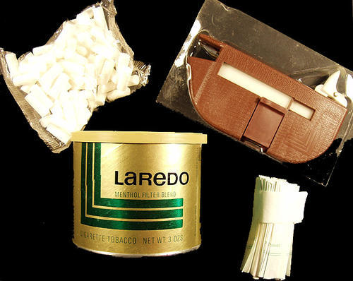 Menthol filters in a cigarette making kit from Brown & Williamson. Instruction, cigarette machine, 100 filters and wrap/papers, 5 cigarette boxes, and 3 oz. tobacco. $5.19.