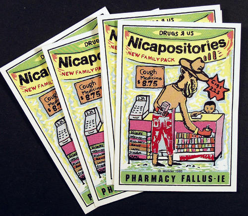 Pharmacy Satire: "Pharmacy Fallus- ie" Camel Joe at store counter, selling items to child's mind. Printed by Doctors Ought to Care.