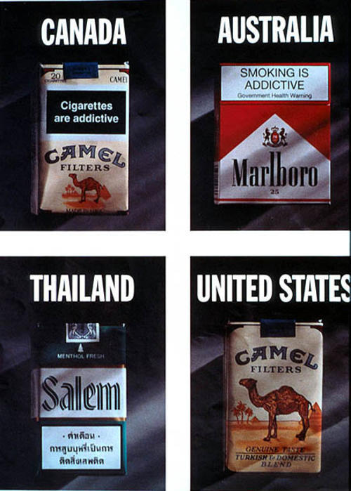 Warning labels visible (or missing) on the face of packs in the US, Canada, Australia and Thailand. (Slide courtesy of Gar Mahood, Nonsmokers' Rights Association, Toronto)