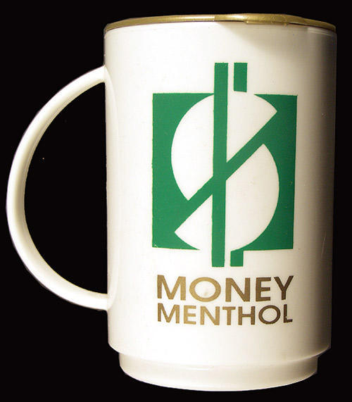 Plastic coffee mug. White, money menthol.