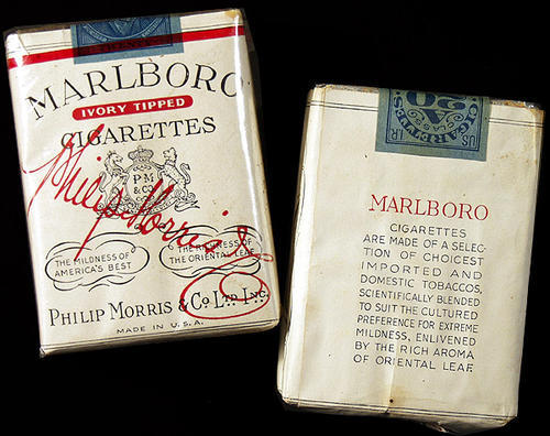 Marlboro was a woman's cigarette ("MIld as May") until its makeover as a filter cigarette in mid-1950s. This pack was made in 1953 but its design dates from the 1920s.