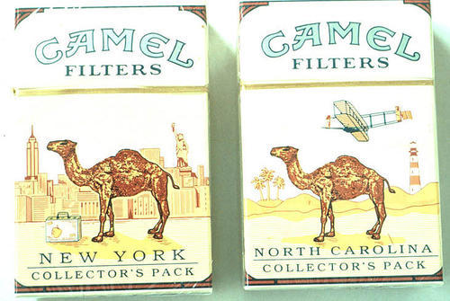 Camel collectors packs commemorating certain states. These packs are part of a series of 10 packs promotion in 1994. The countertop display urged customers to "collect all ten". Depicted here are North Carolina and New York.