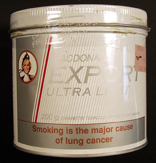 Ultra light 200 g Tobacco. Made in Canada. Some print not in English. Large round grey tin.