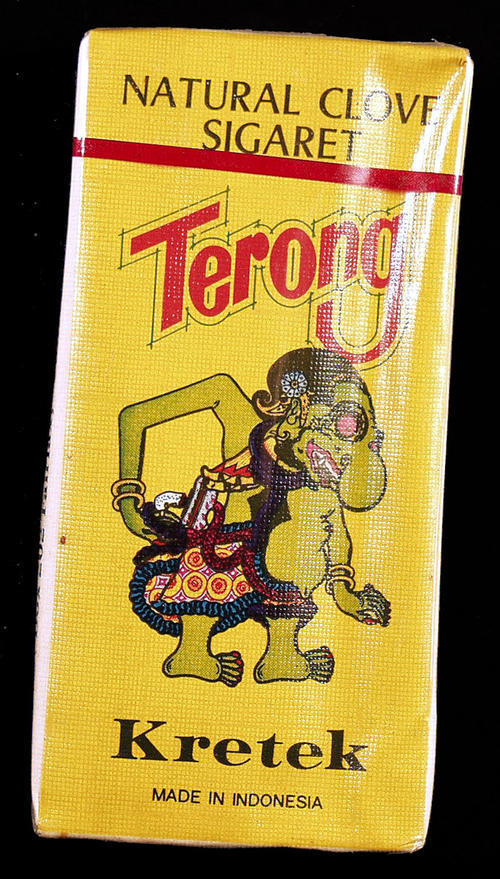 Cigarettes pack from Indonesia. Cloves, small yellow pack and mythological character.