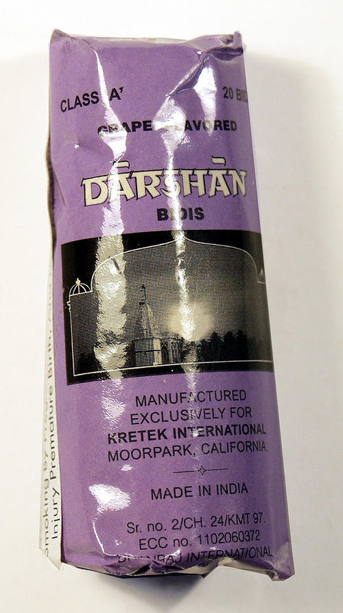 Purple cone of Bidis, grape flavored. From India. Images of a temple.