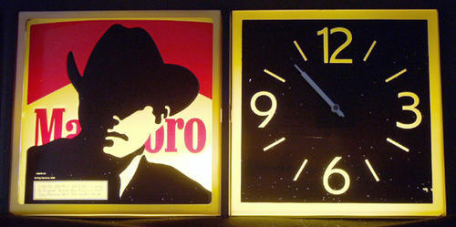 Two toned (black and white) Marlboro Man slongside electric indoor clock display. Marlboro Man lights up as well.