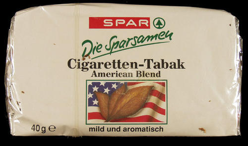 "SPAR-Cigaretten-Tabak" labeling not in English. 40 g. American blend tobacco; $3.60- American flag pictured on front with tobacco leaves.