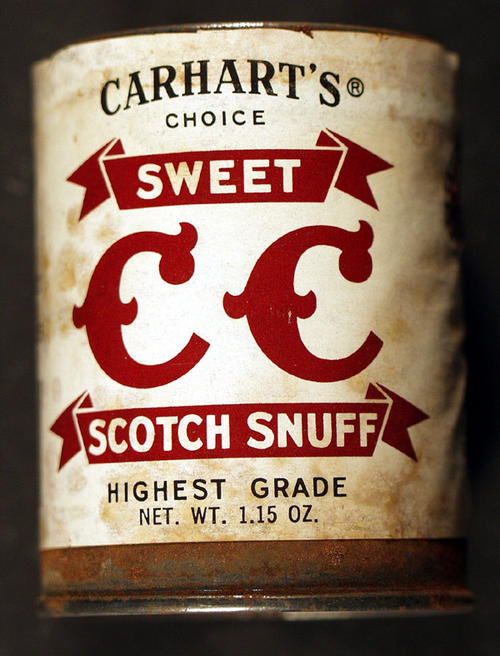 Sweet CC SCotch snuff. $1.15, short rusted tin container, white labeling.
