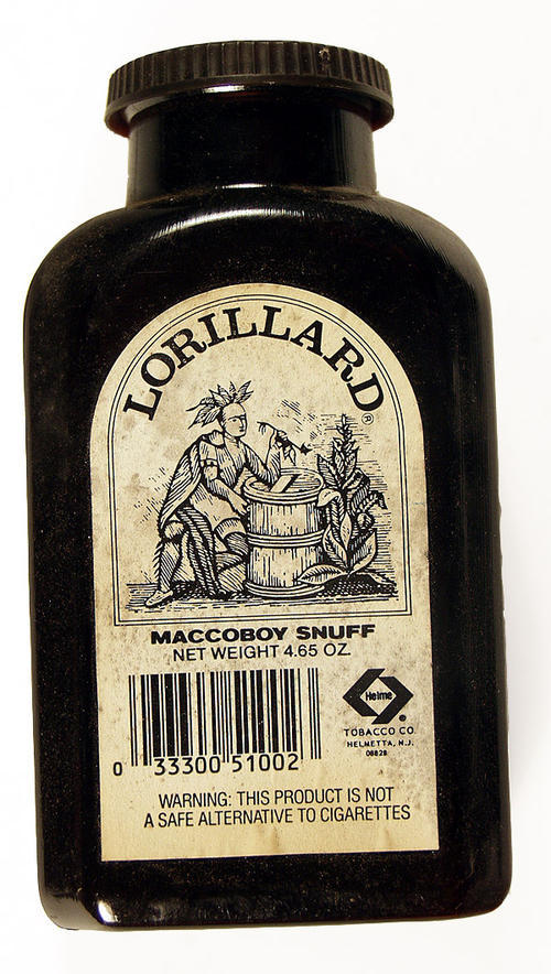 Resembles vintage medicine bottle; made of plastic. Lorillard-Maccoboy snuff. 4.65oz. "This product is not a safe alternative to cigarettes." Snuff inside bottle.