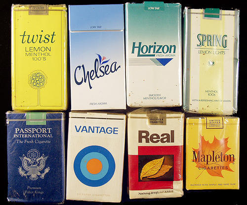 Good tastes and smaller, less visible smoke and all natural: Perfumed cigarettes date from the first decade of the century. Flavorings and other additives have long been part of cigarette manufacture. Most of the world market is licorice is for use in tobacco products. Here are some brands that particularily emphasized a flavor or smell attritube. Spring, Chelsea, and Horizon were only tried out in test market. The gimmick for the latter two was a perfume that was emitted as the cigarette burned like an incense to make the smoke the smoke smell less offesnive. Mapleton (UST, early 60s), Twist (American, 1973), Spicy Lemon Light (Lorillard, 1989), Chelsea (RJR, 1989). Starting with Passport in Canada, several manufacturers have promtoed cigarettes that produce less visible sidestream smoke through the use of various paper additives. Vantage Excel (RJR, 1989) was one such atttempt. As with the perfumed and incense burning brands, these take a cosmetic, public relations approach to a public health problem. real (RJR, 1975). "NOthing Artificial Added" The motif is also found in Nat Sherman's cigarettes and in American Spirit. The letter are sold in health food stores. Only real in on display.