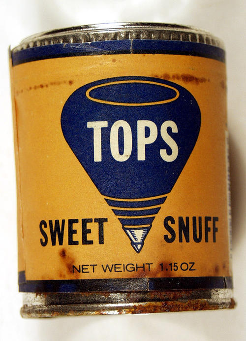Sweet snuff-short rusted tin container, orange label- 1.15oz.