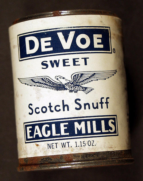 De Voe sweet scotch snuff- Eagle Mills. Short rusted tin with white labeling.