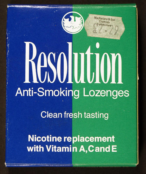 Resolution, Anti-smoking Lozenges (24) Nicotine replacement with vitamin A,C, and E. Dissolve lozenge in mouth at time of craving. Contains nicotine. Insert lists tips, encouragement to cease and further reading. $2.29.