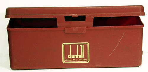 Red hard plastic lunch/tool case. Dunhill logo on top and front.