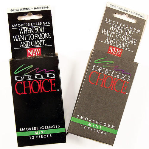 Box mailed from Advantange, California. 5 packs of Smoker's Choice mint cessation candy. Half are lozenges and the other half are gum; mint flavored, 12 pieces containing Lobline.