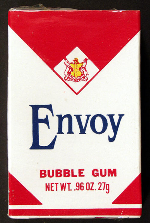 Envoy. Magic Colors Bubble Gum. 57 cents. packaging of red and white colors and diamond shapes is reminiscent of Marlboro.