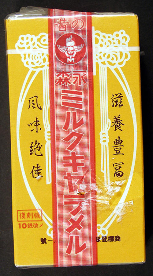 Morinaga's milk caramel. Box is yellow. Print not in English. Slide box. Japanese. Packaging looks like cigarette pack.