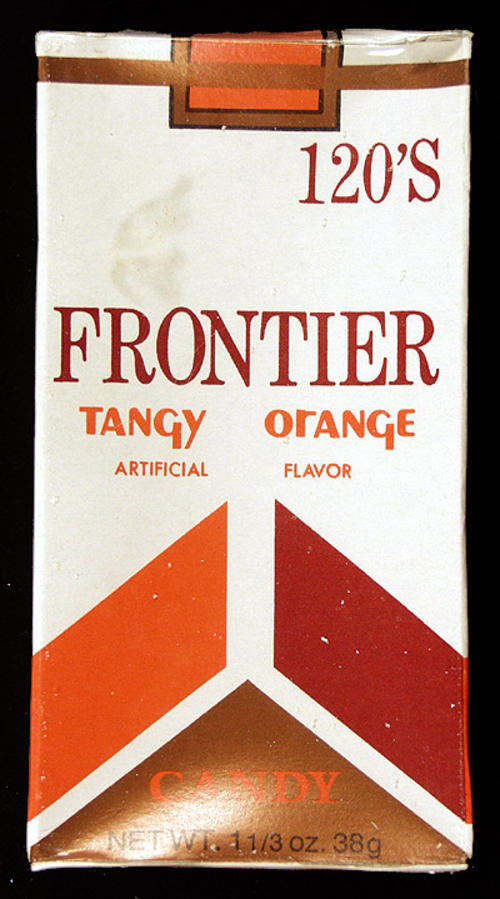 Frontier brand tangy orange candy. 120's.Packaging made to look like a cigarette pack.