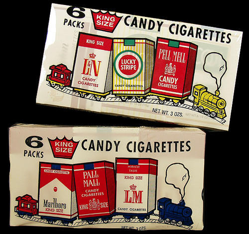 6 candy cigarette boxes in a large pack- 49 cents from Shop Rite. King size Pell Mell- made to look like Pall Mall. L & N- L&M. Lucky Stripe- Lucky Strike. Cool- Kool.